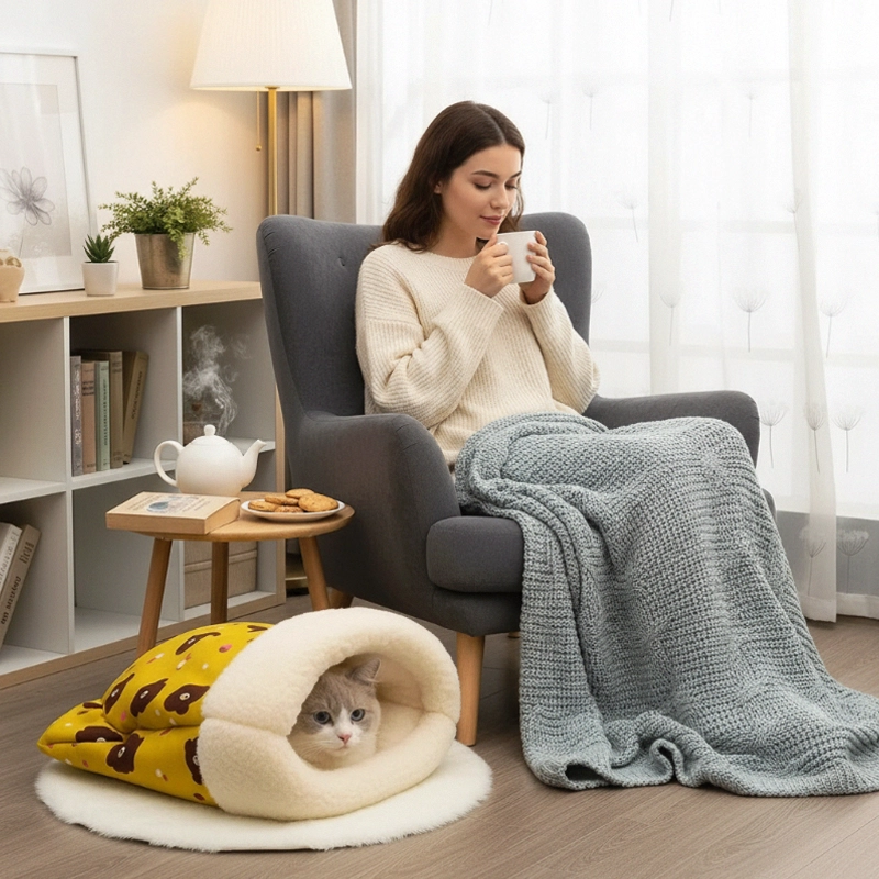 Et lukket rom gir sjenerte kjæledyr privatliv vekk fra støy. Den buede utformingen holder varmen inne og stenger ute kald luft.