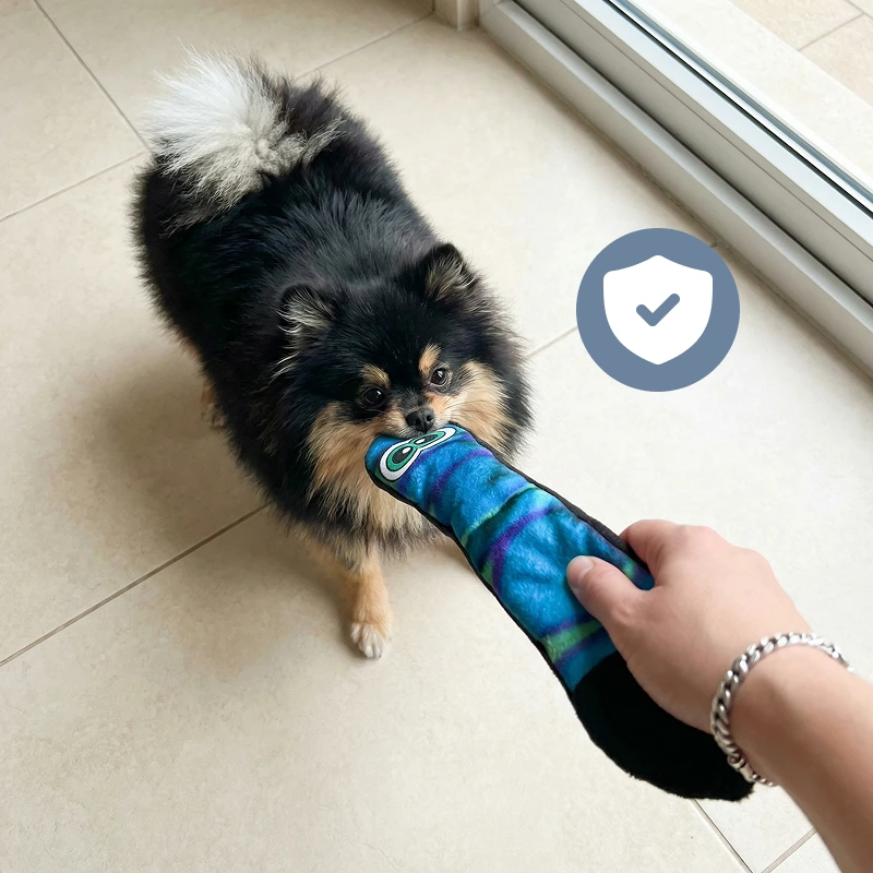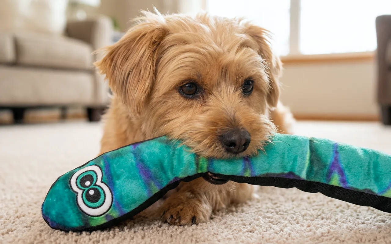 Valpen min blir superivrig så snart han ser den fargerike slangen. Materialet er skånsomt for tennene hans, og han leker i timevis uten å bli lei.