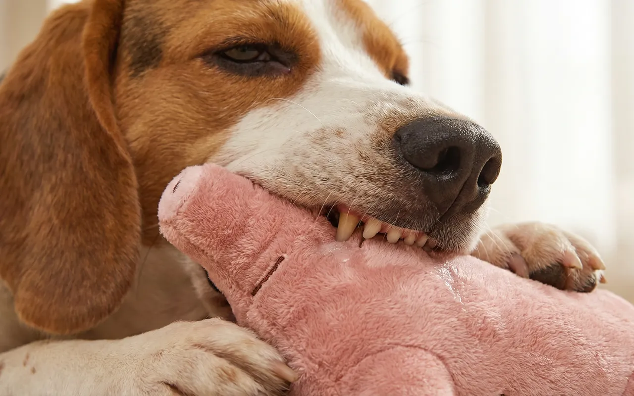Den unge hunden vår pleide å tygge på sko, nå holder han seg til denne plysjgrisen. Den holder ham fokusert, og pusten hans lukter til og med bedre.