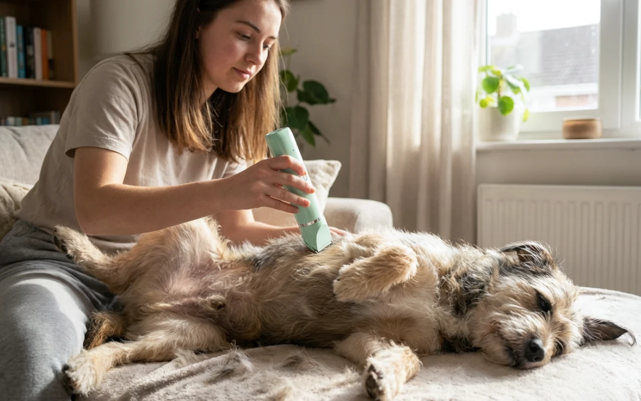 Den eldre hunden min er nervøs for høy lyd, så den stille motoren er perfekt. Han sitter i fanget mitt mens jeg steller ham og ser avslappet ut.
