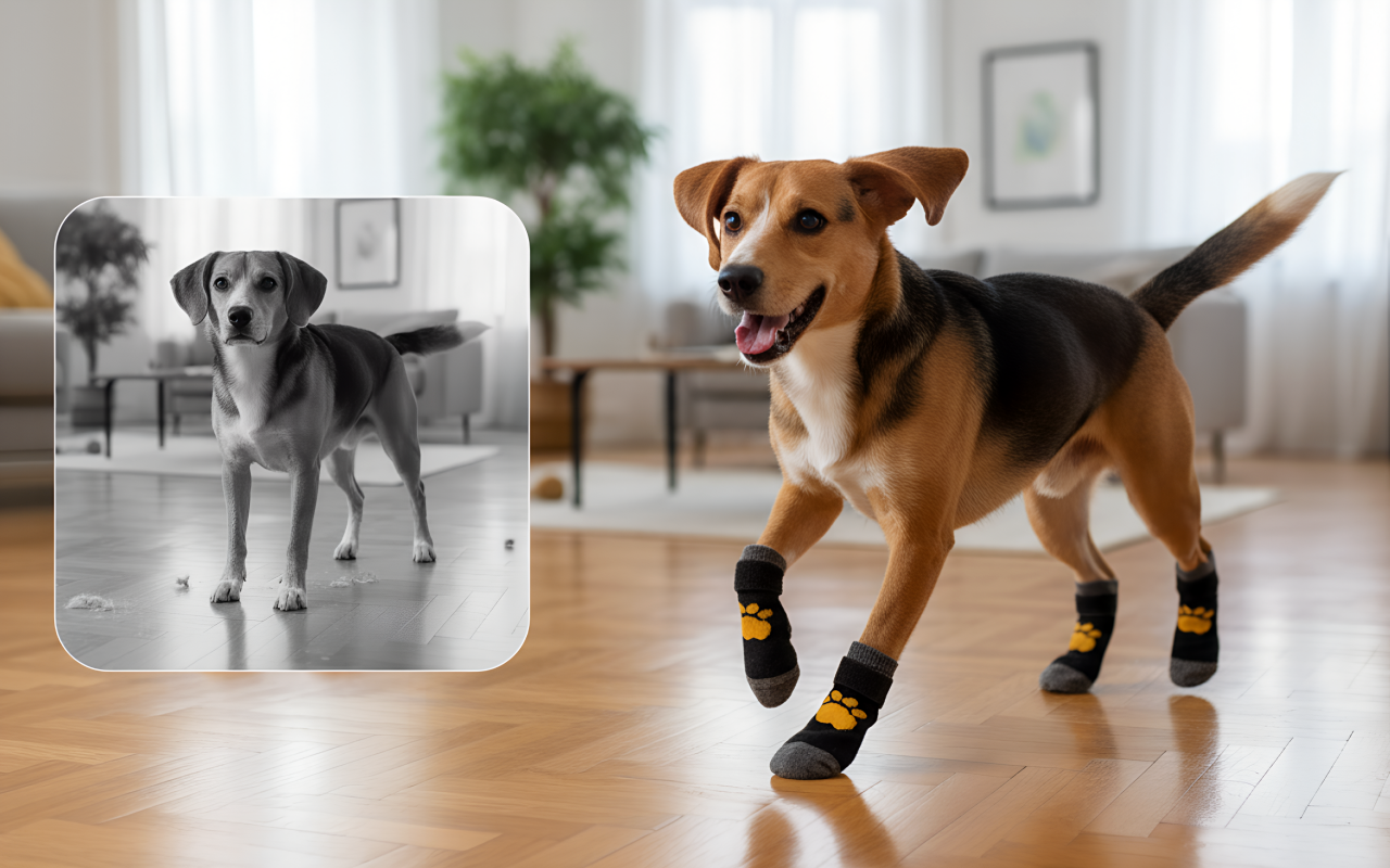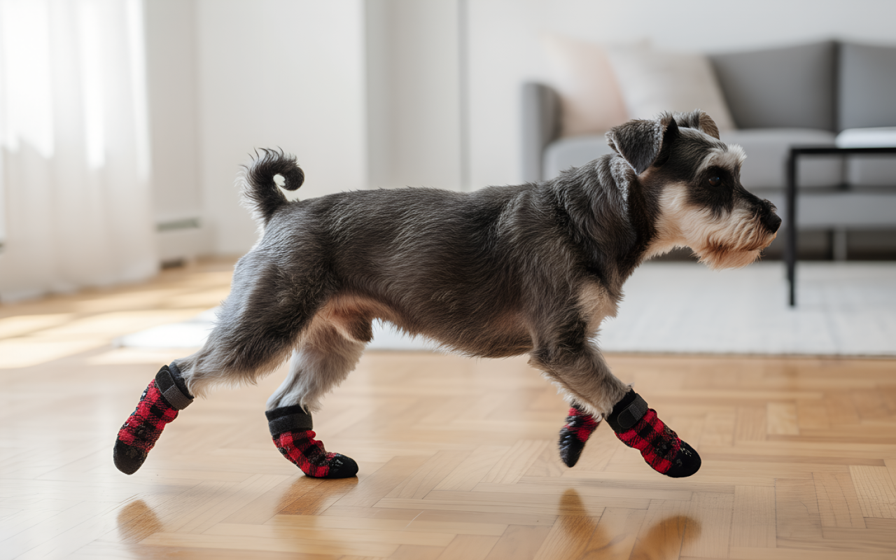 Buddy sklir med bakbeina fordi han er gammel, men disse sokkene gir ham bedre feste. Han går stødigere og er mindre nervøs på glatte gulv.