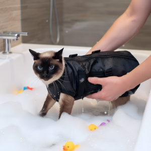 Elsker hvor enkelt det er å sjamponere katten min med denne posen. Stramme hull holder potene hennes trygt inne og hendene mine trygge også.