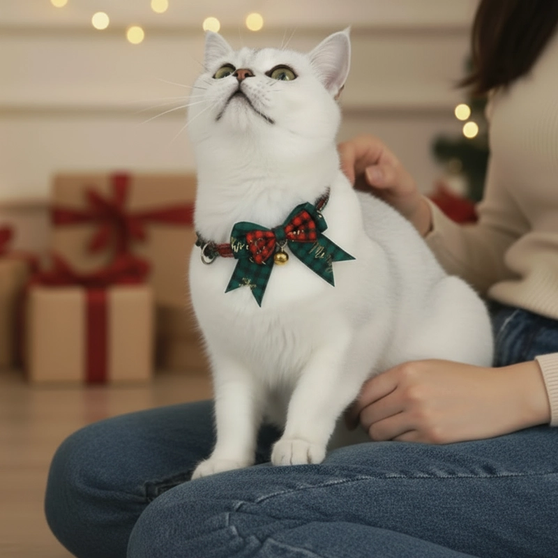 Katten min ser ekstra søt ut denne julen med den nye sløyfen sin! Rutemønsteret er veldig morsomt, og den gyldne bjellen ringer når hun løper rundt.