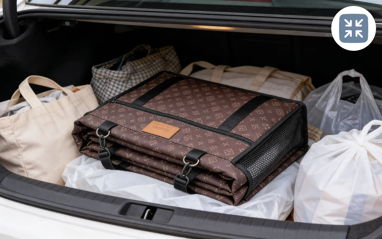 Enkel sammenleggbar design gir ingen problemer ved lagring mellom turene. Nettinglommer hjelper deg å organisere leker, bånd og godbiter pent.
