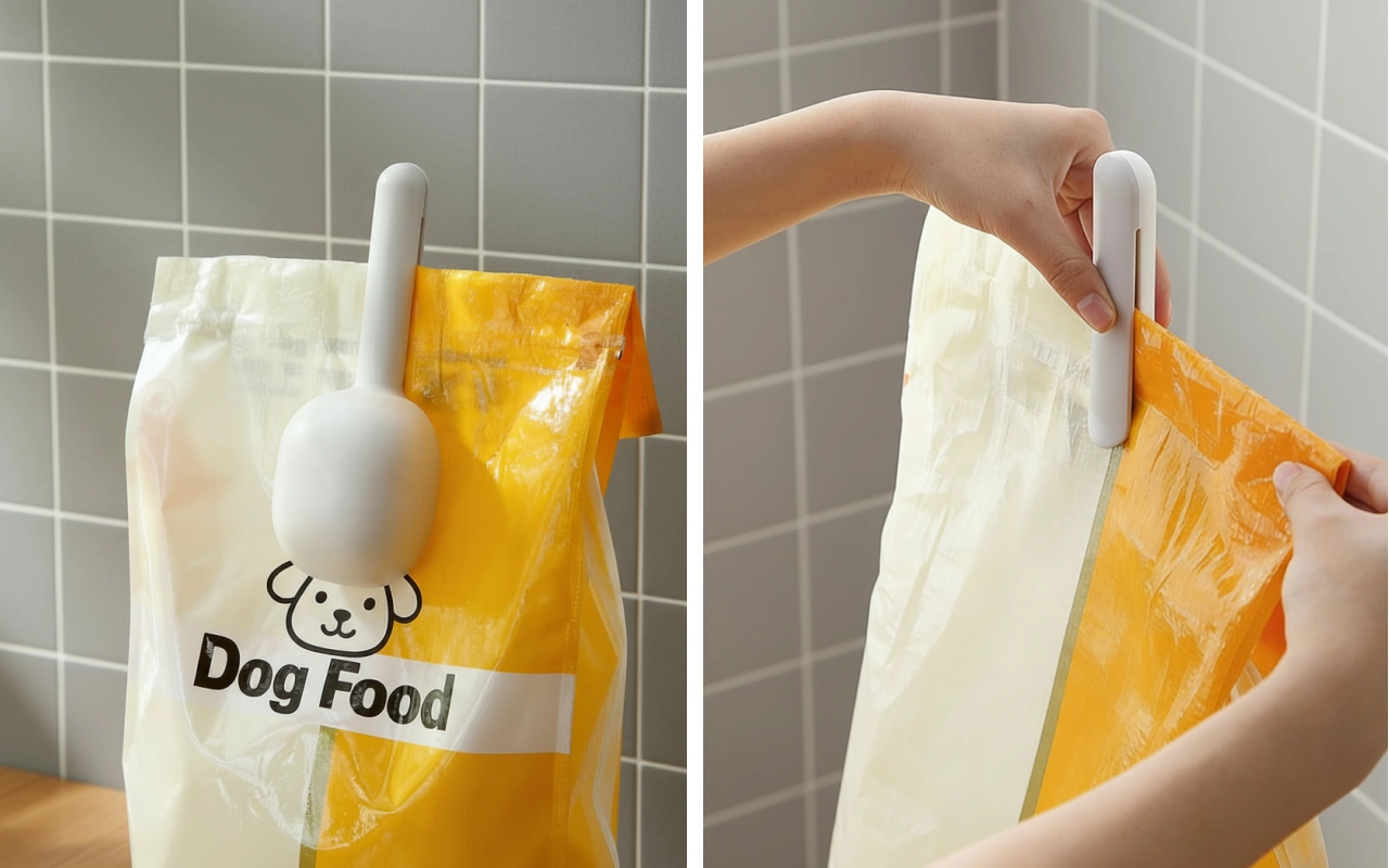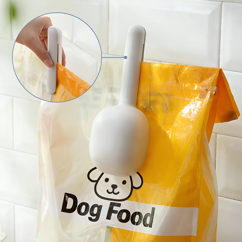 Jeg elsker å bruke denne måleskjeen hver dag fordi den holder hendene mine rene og hundematen søler aldri. Klypen gjør virkelig at maten holder seg fersk lenger.