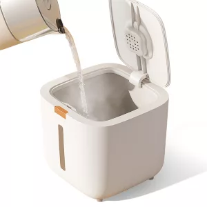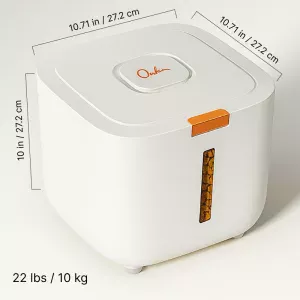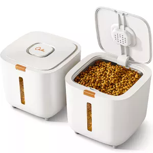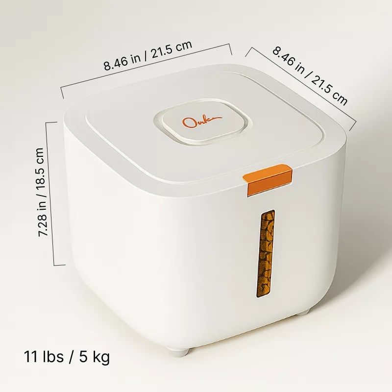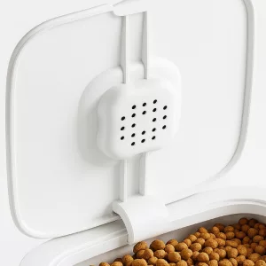 Denne beholderen passer perfekt i hjørnet av matskapet mitt. Valpens mat blir ikke fuktig av luft lenger. Veldig hjelpsom!
