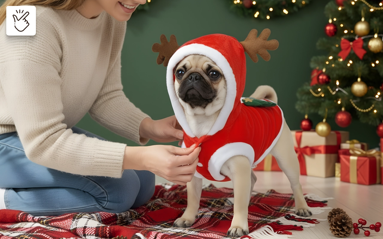 Kjøpte denne koselige reinsdyrdrakten til vår golden. Lett å kle på, sitter fint, og ser ut til å holde godt etter flere bruk. Morgenene i høytiden ble nettopp enda søtere!