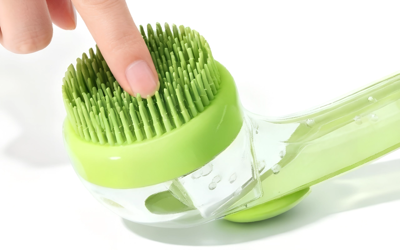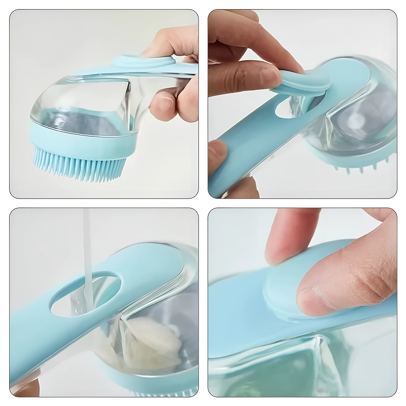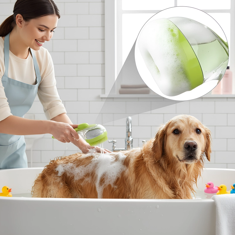 pet bath brush, bath brush with shampoo dispenser, dog silicone bath brush, dog bath brush with long handle
