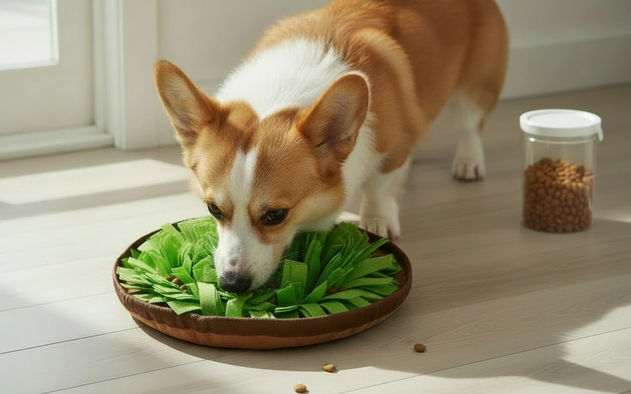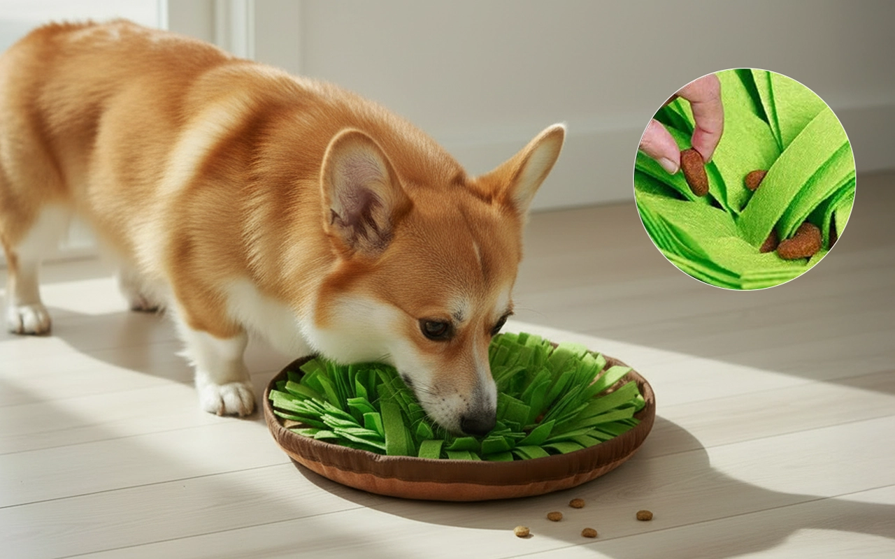 Redningshunden vår sliter med nerver, men å lete etter foret i denne morsomme matten hjelper virkelig til at han slapper av under måltidene.