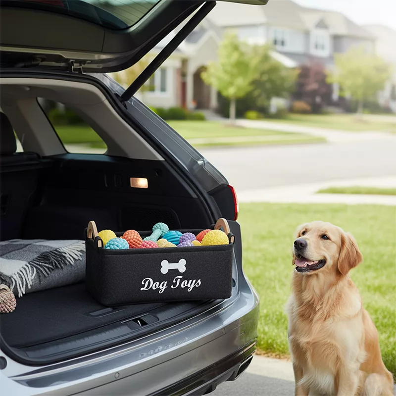 Hunden min graver etter lekene sine og boksen gjør det enkelt for henne. Alt er på ett sted, og jeg elsker hvor myk filten er.