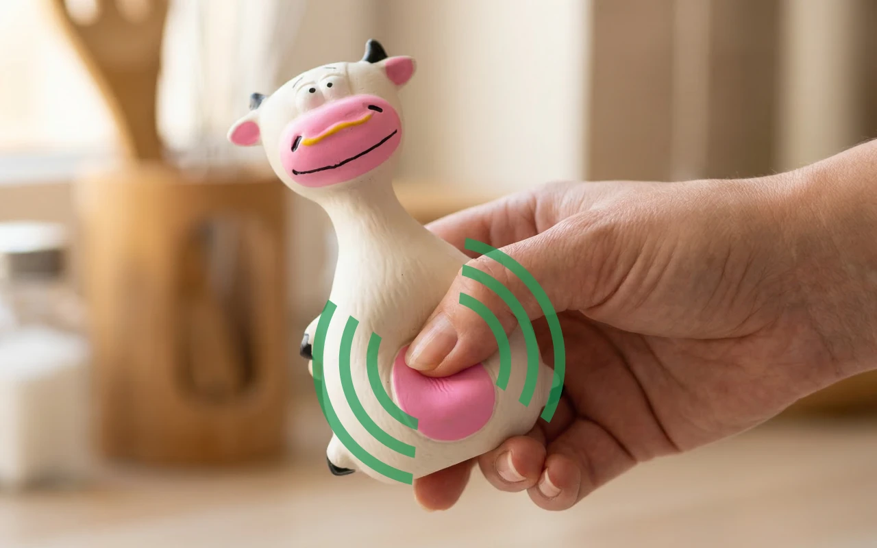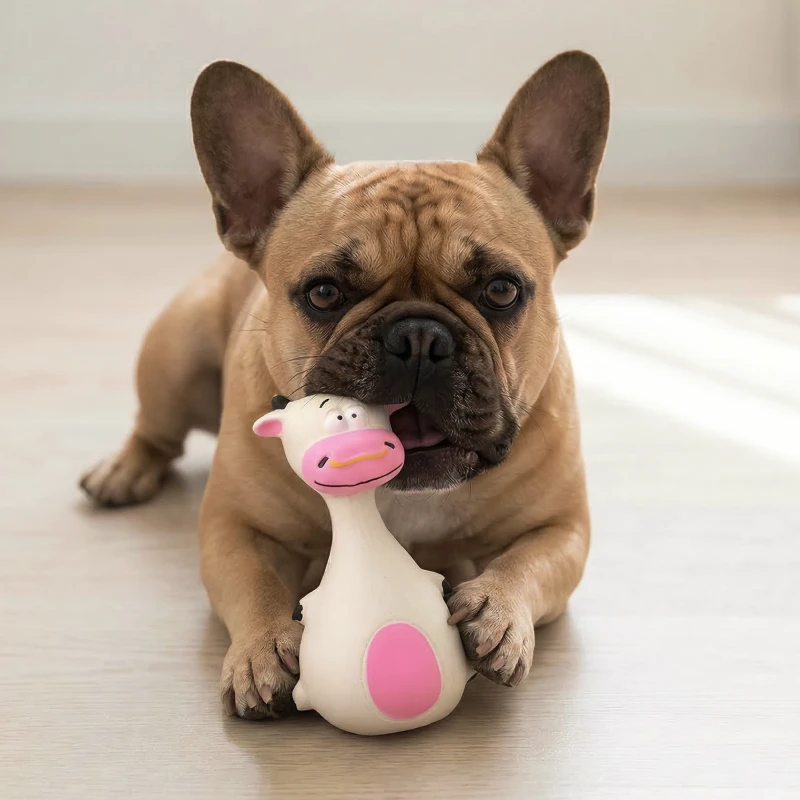 Holdbar tyggeleke for hund i tegneseriestil med pipelyd