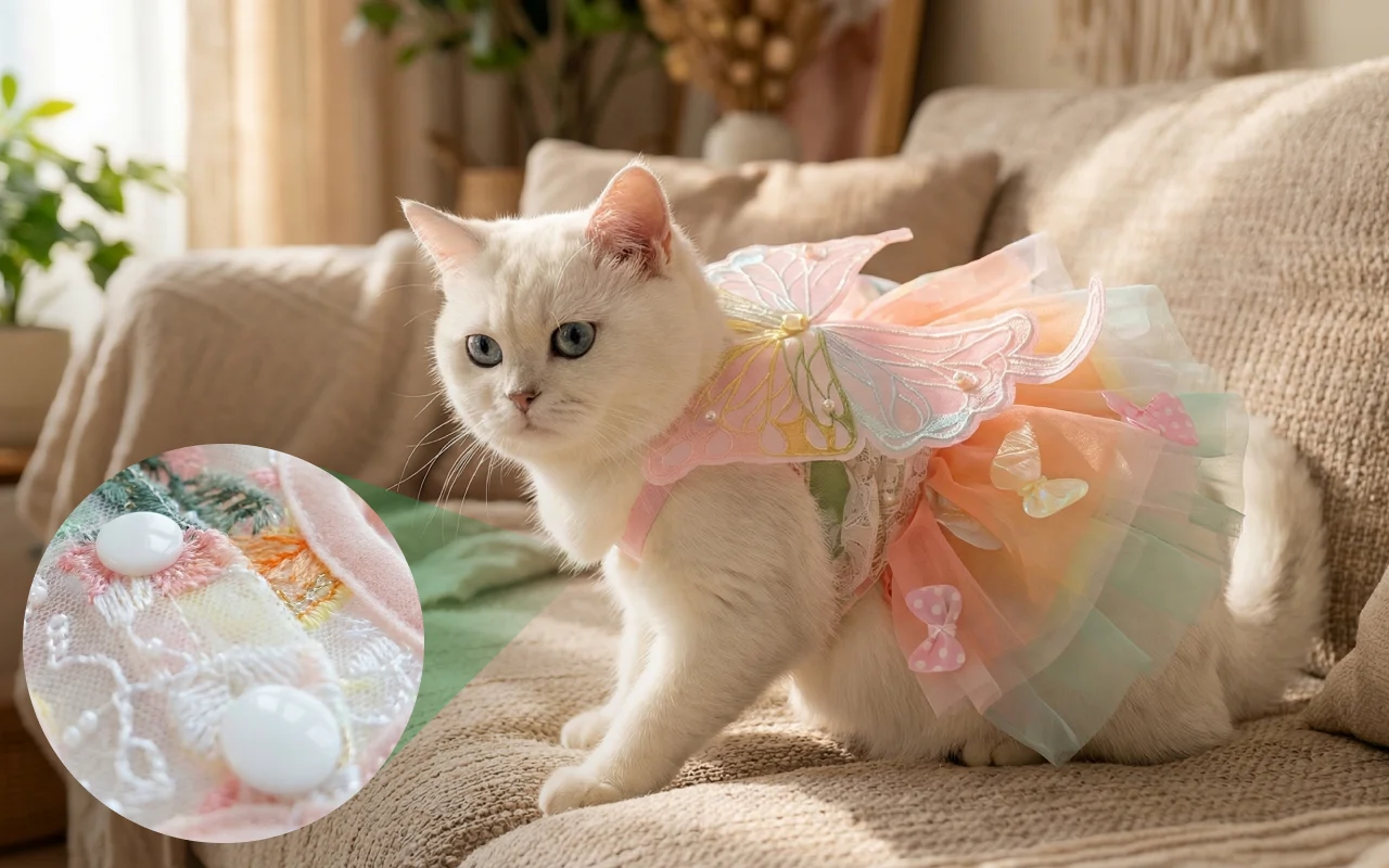 Kjøpte prinsesseantrekket til julebilder. Det passer både min lille hund og venninnens katt, og vingene sitter på plass mens de leker.