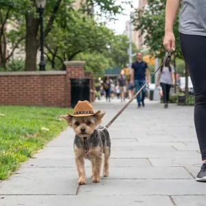 Hunden vår ser ut som en liten cowboy; naboene smiler på hver tur.