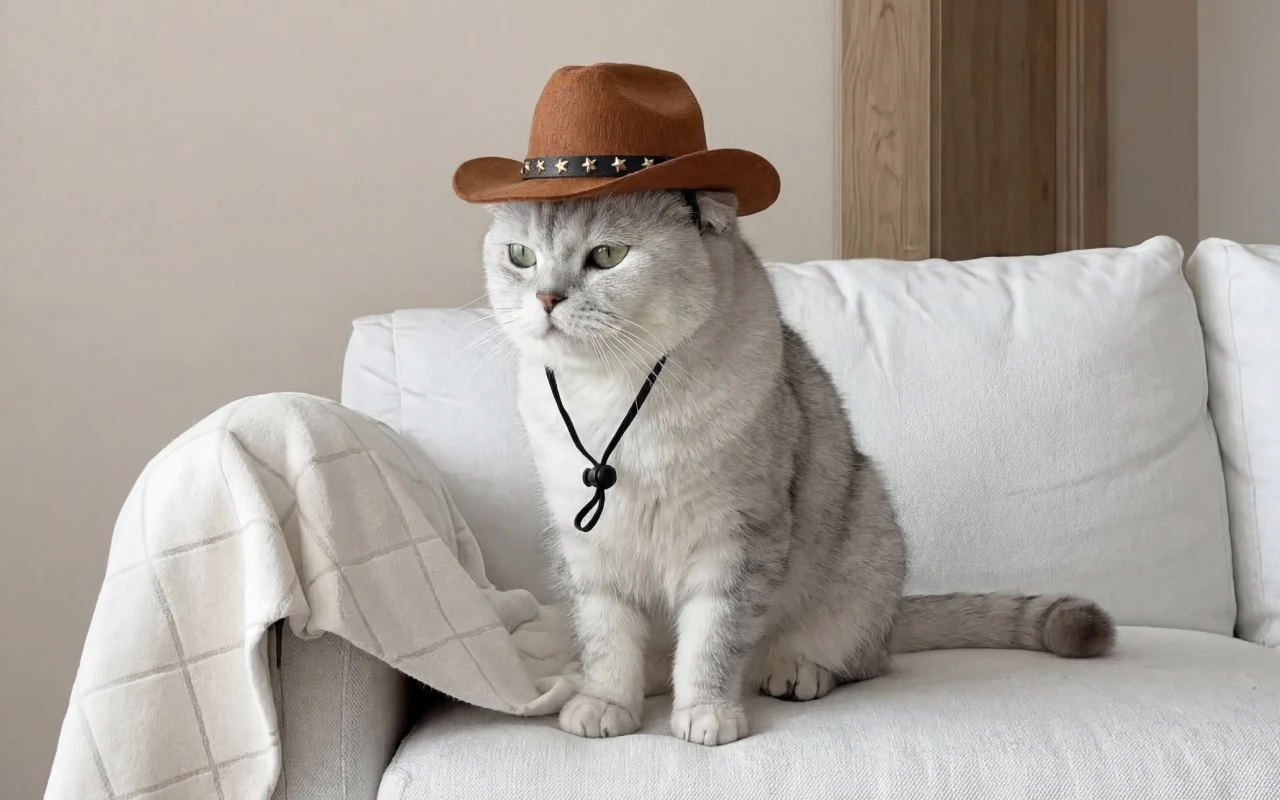 Jeg bestilte hatten til katten min som en spøk, men det ble en daglig greie. Hun ligger på sofaen med den på og ser ut som en liten sheriff.