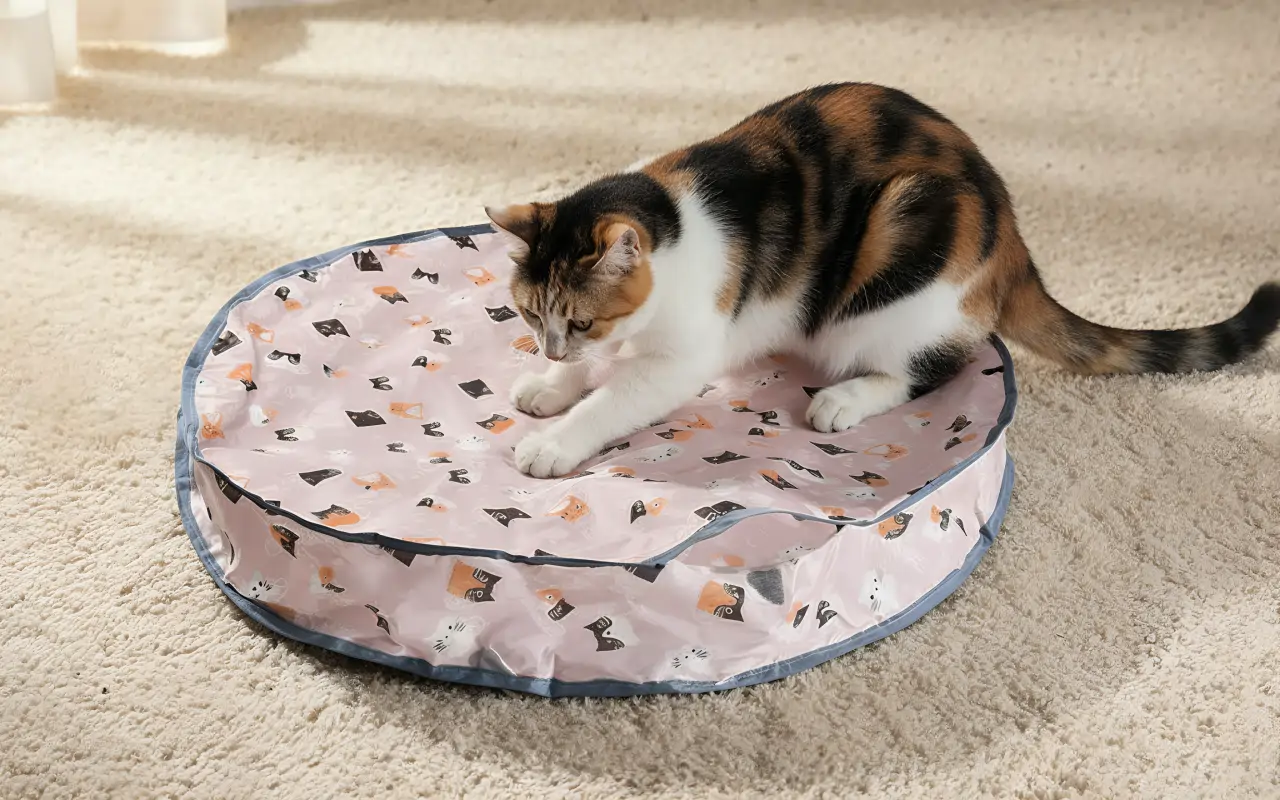 Primdog gjør innendørs moro enkelt for enhver nysgjerrig kattunge. Legg favorittballer eller godbiter under posen for endeløs spenning. Katter elsker å utforske, jakte og smyge seg innpå ved å bruke dette enkle gjemmestedet. Det lette trekket er lett å flytte eller oppbevare.