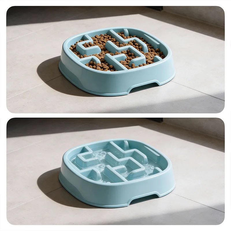 Beaglen min pleide å sluke maten sin altfor fort. Nå gjør labyrintmønsteret at han spiser saktere, og han ser faktisk ut til å kose seg mer.