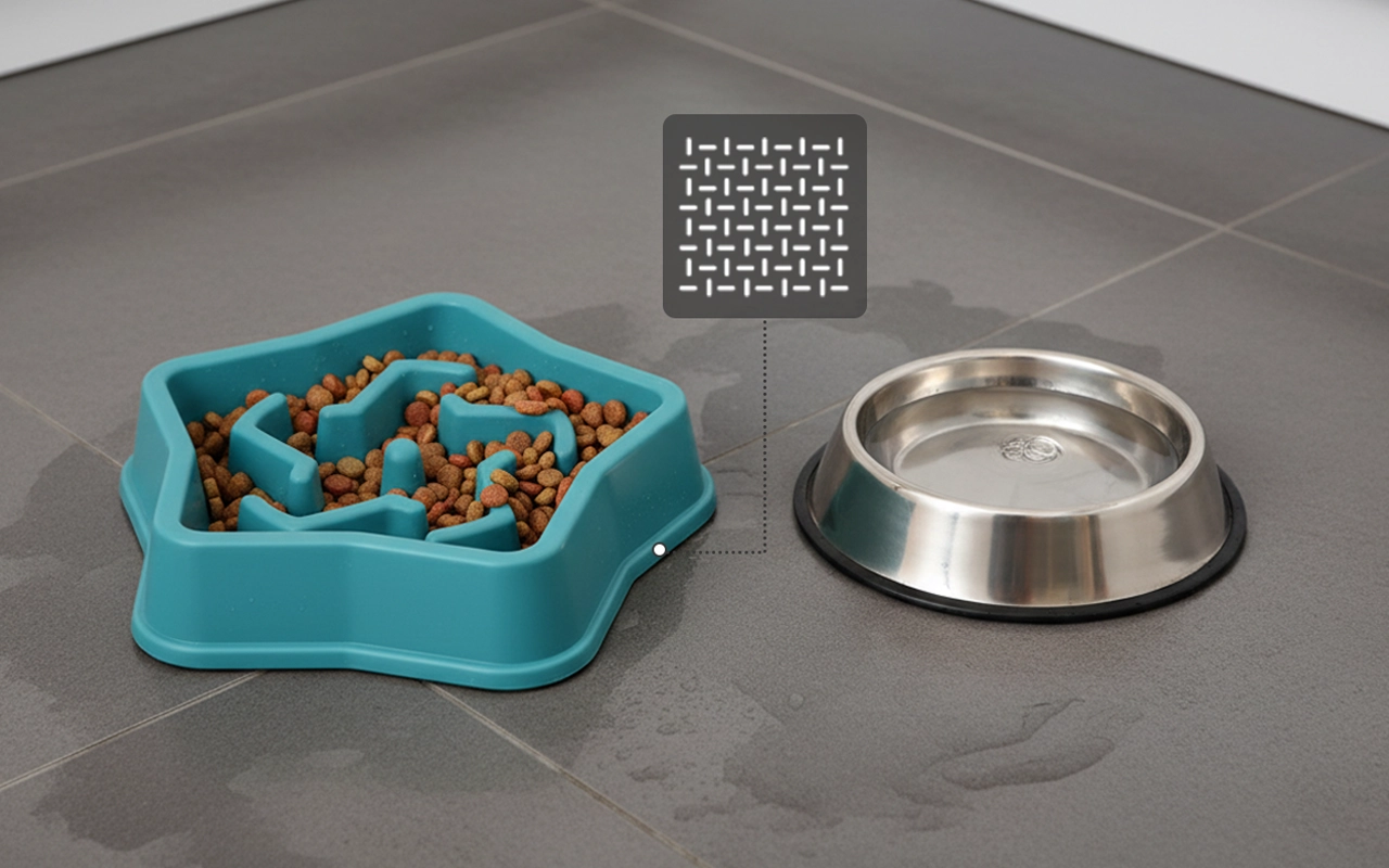 Primdog-matskålen bruker en smart labyrint som deler maten opp. Rask spising kan skade magen til din venn og føre til kvelning. Hver bit går saktere ned og gir lettere svelging hver dag. Kæledyret ditt vil ha det hyggeligere under måltidene med mindre søl.