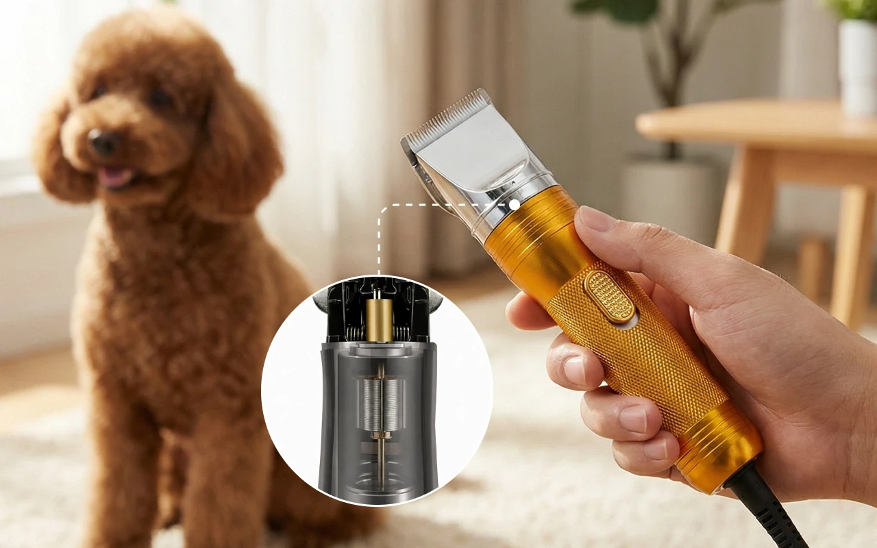 Sterk motor klipper raskt uten å lage høye lyder. Kjæledyr holder seg rolige og avslappede under klippingen.