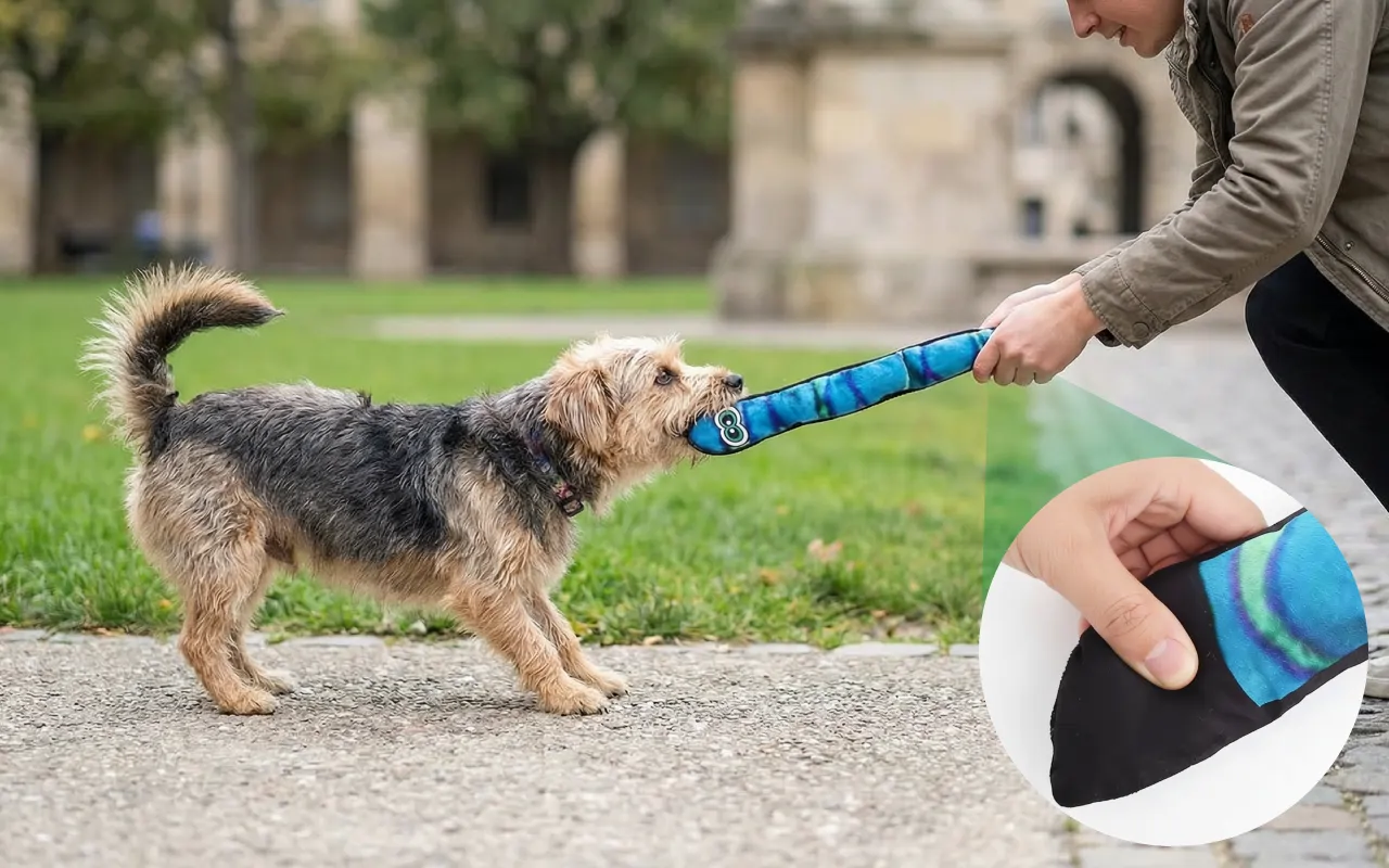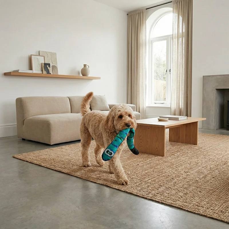 Valpen min blir superivrig så snart han ser den fargerike slangen. Materialet er skånsomt for tennene hans, og han leker i timevis uten å bli lei.