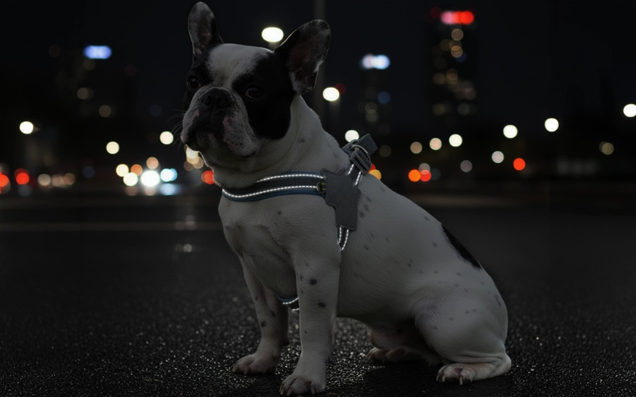Jeg går tur med hunden min på kvelden, og de reflekterende delene lyser virkelig opp. Hun ser søt ut, og jeg føler meg trygg når vi krysser gata sammen.
