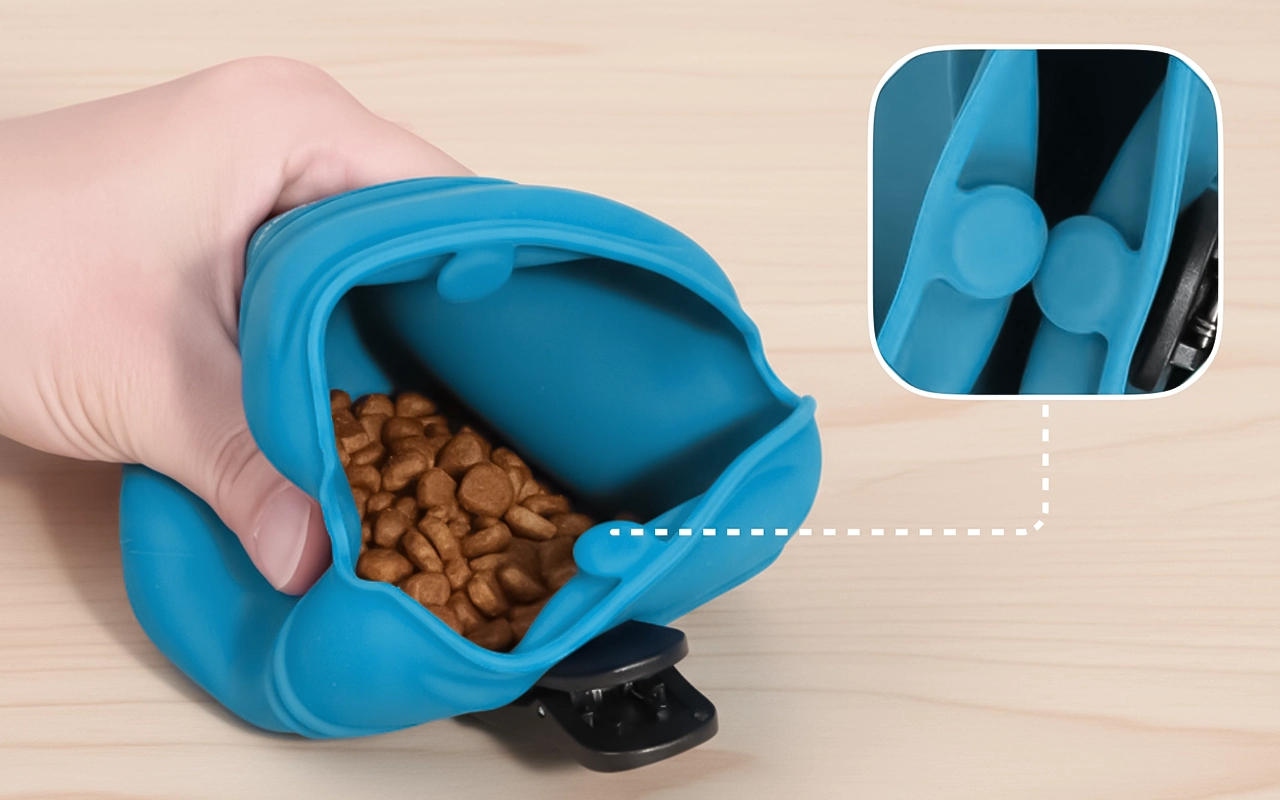 Ikke mer leting etter godbiter under trening. Den magnetiske lukkingen smekker raskt igjen, slik at du får tak i godbiter raskt.