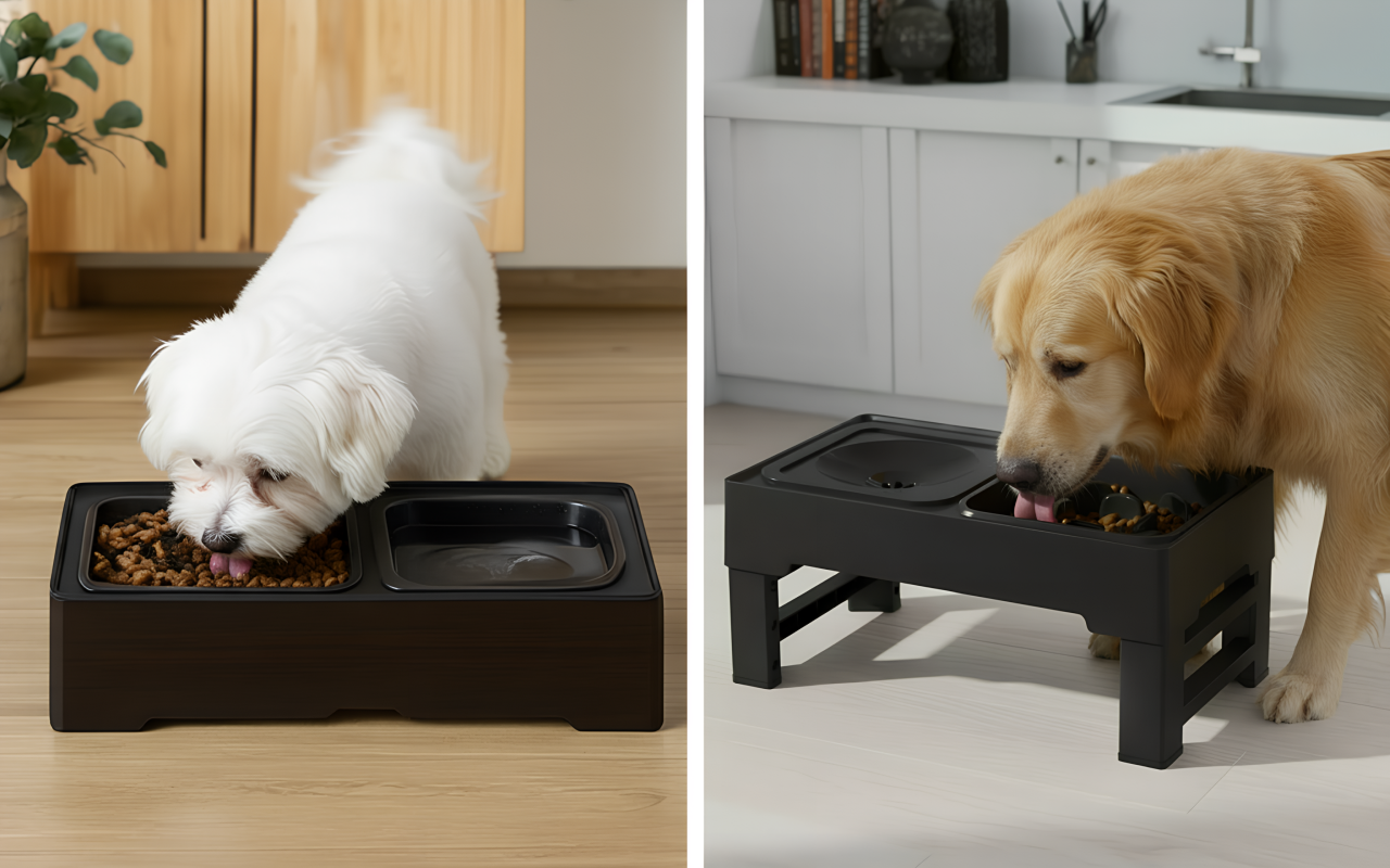 Dobbel fôringsskål med stativ for sakte fôring til hund
