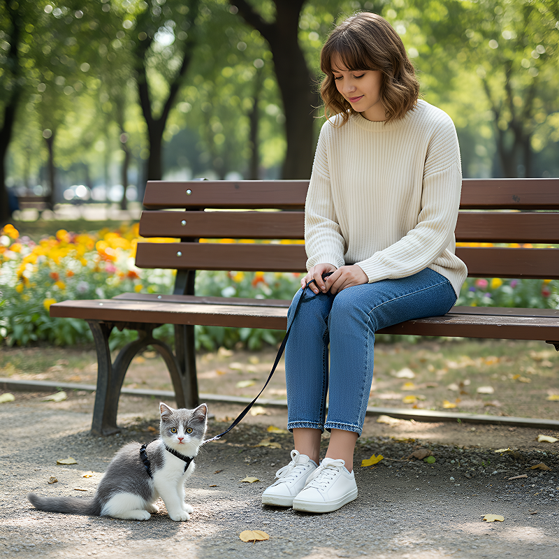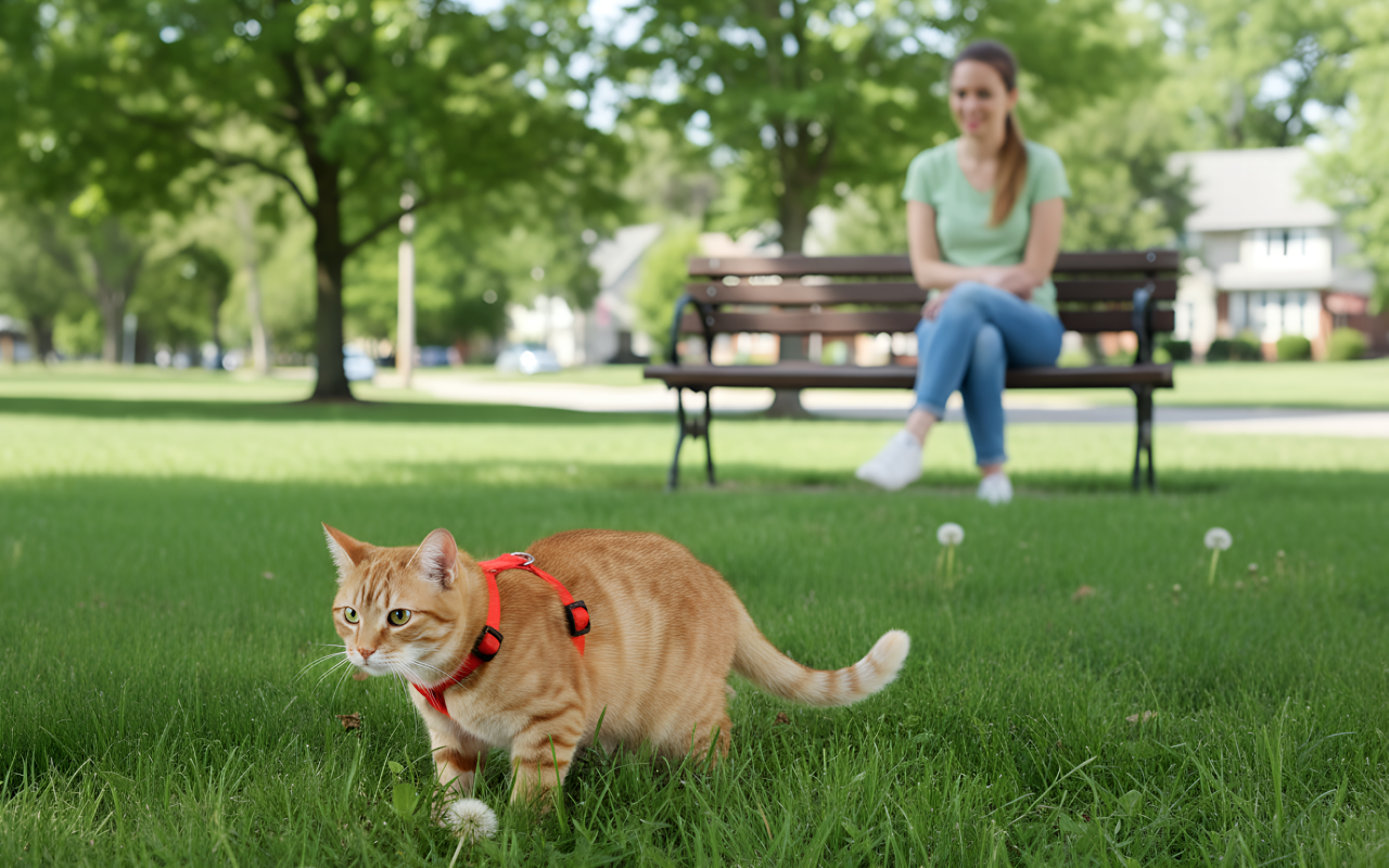 Katten min pleide å hate seler, men denne er myk og han tolererer den i flere timer. Vi koser oss på tur og møter andre kjæledyr i parken.