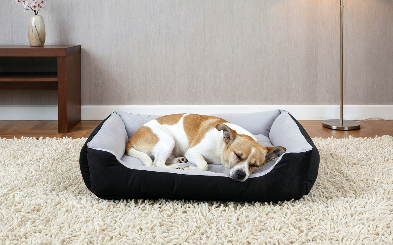 Den lille hunden vår elsket sengen sin med en gang. Den myke polstringen er så behagelig, han koser seg rett inn. De hevede kantene får ham til å føle seg trygg og lun.