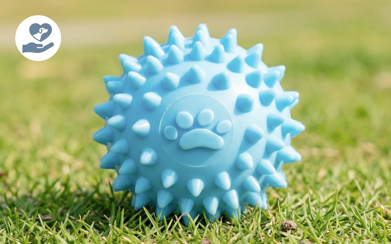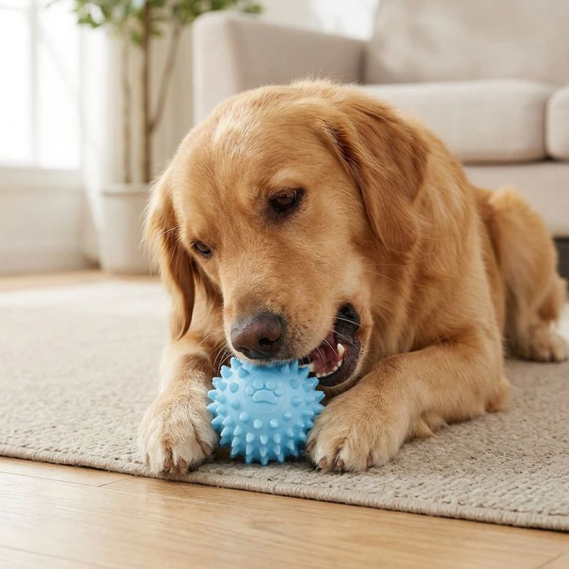Den piggete ballen hjelper den eldre hundens tenner å holde seg rene mellom veterinærbesøkene. Han gleder seg til å leke med den hver ettermiddag.