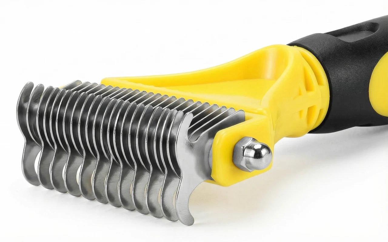Jeg steller hunden min hjemme nå. Stålraken fjerner underull, etterlater henne blank i pelsen, og håndtaket føles sikkert selv når hendene mine er fuktige.