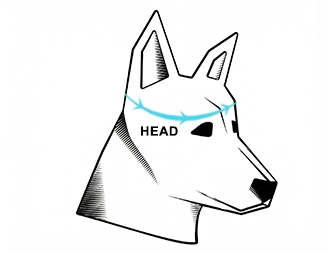 - 1. Vikle målebåndet rundt den bredeste delen av hundens hode, akkurat foran ørene.