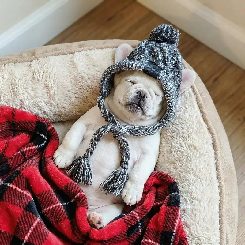 Mopsen min ser så søt ut i denne strikkeluen! Ørehullene er akkurat passe og holder det lille hodet hennes varmt selv på vindfulle morgener i parken.