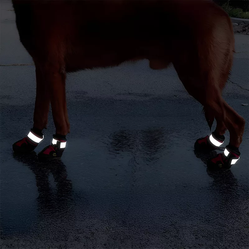 Disse hundeskoene er perfekte for kveldsturer. De reflekterende stripene gjør din pelskledde venn synlig i dårlige lysforhold.