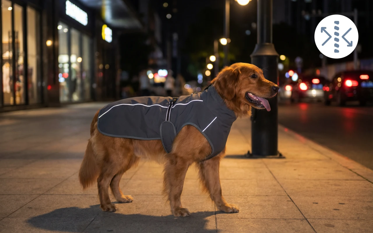 Refleksdetaljer lyser opp når billys passerer. Kveldsmosjoner blir tryggere for både eiere og lekne hunder.