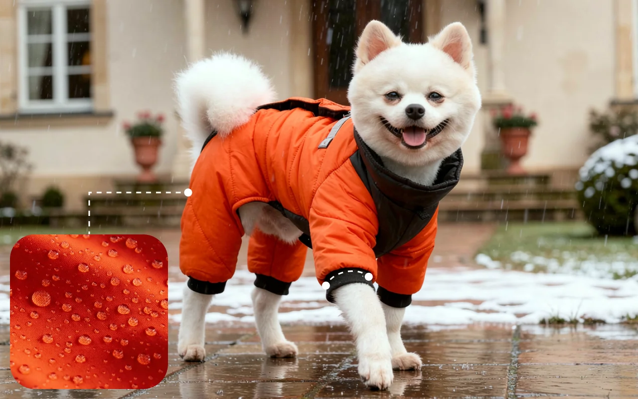 Den lille hunden min ser så søt ut og holder seg tørr på regnværsdager. Jakken festes raskt og holder under løpeturene i parken.